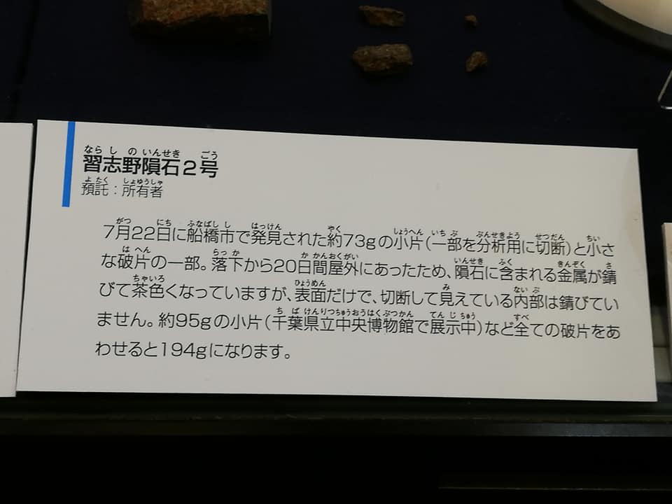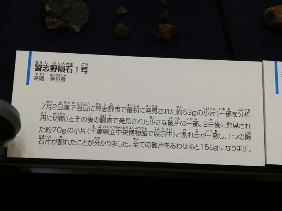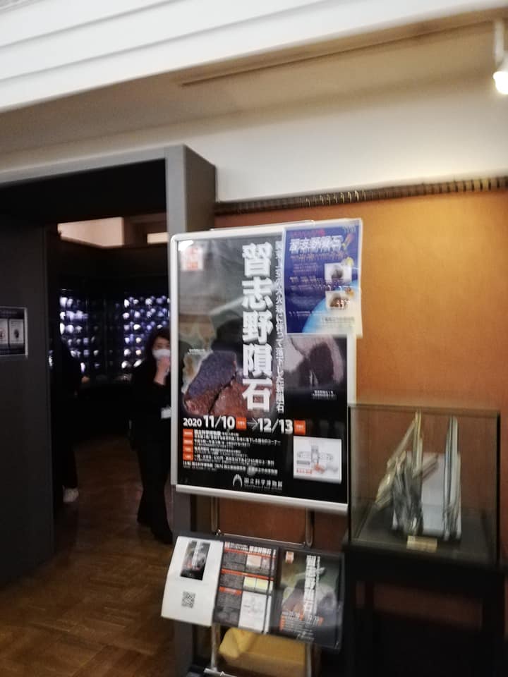 タイムリーな話題です! 11月29日に『習志野隕石』を観に行ってきました。その前日に、西日本では火球の件で話題がもちきりでしたね!今回、千葉県習志野市などで発見された「習志野隕石(いんせき)」の実物が、国立科学博物館(東京都台東区)で展示されていました。隕石は、拳より小さいくらい石でした。当日は、新型コロナウィルスの影響により「我慢の3週間」と言うことで自粛ムードの中、上野駅の人出はかなり少なかったです。