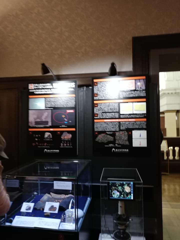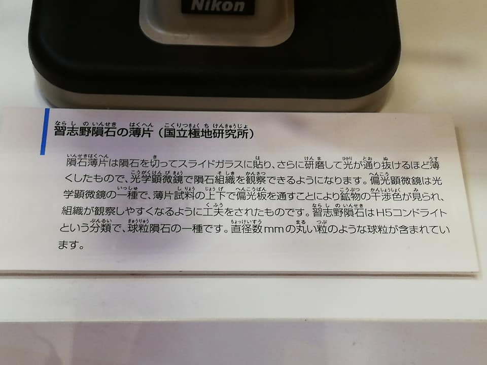 展示会場では重さ70グラム前後、長さ約5センチの破片二つが展示されています。ほか、薄片を特殊な顕微鏡で拡大した画像が映し出され、鉄やニッケルなどを含む様々な鉱物を観察できるように展示されていました。